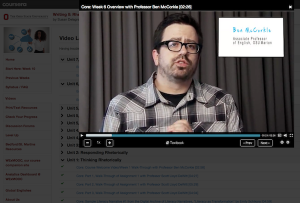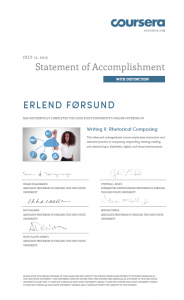 Jeg gjennomførte det 10 uker lange kurset Writing II: Rhetorical Composing via Coursera. Hver uke ble det lagt ut nye videoer, både i form av presentasjoner av teoretiske emner, personlige forelesninger, intervjuer og samtaler mellom professorer, eksperter og studenter. Jeg ble hele tiden testet på det jeg lærte via innleveringsoppgaver og multiple choice besvarelser.
