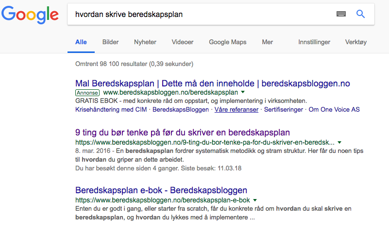 Han klikker på '9 ting du bør tenke på før du skriver en beredskapsplan' og kommer til denne artikkelen på Beredskapsbloggen. Her ser han at dette er en blogg som redigeres av One Voice, og at den handler om fagområdet sikkerhet og beredskap.