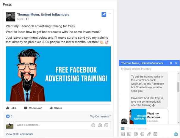 Bruk bots i Facebook Messenger til å spre et innholdstilbud raskt og enkelt. Be Facebook-brukerne kommentere «Ja, takk» på innlegget ditt og la chatboten gjøre arbeidet for deg.